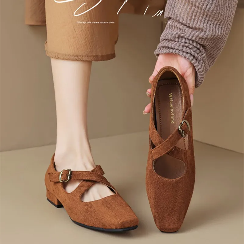 That rich, grounded brown instantly pulls an outfit together without trying. The crossed strap and soft suede finish give it a relaxed confidence that works from errands to dinners without a second thought.