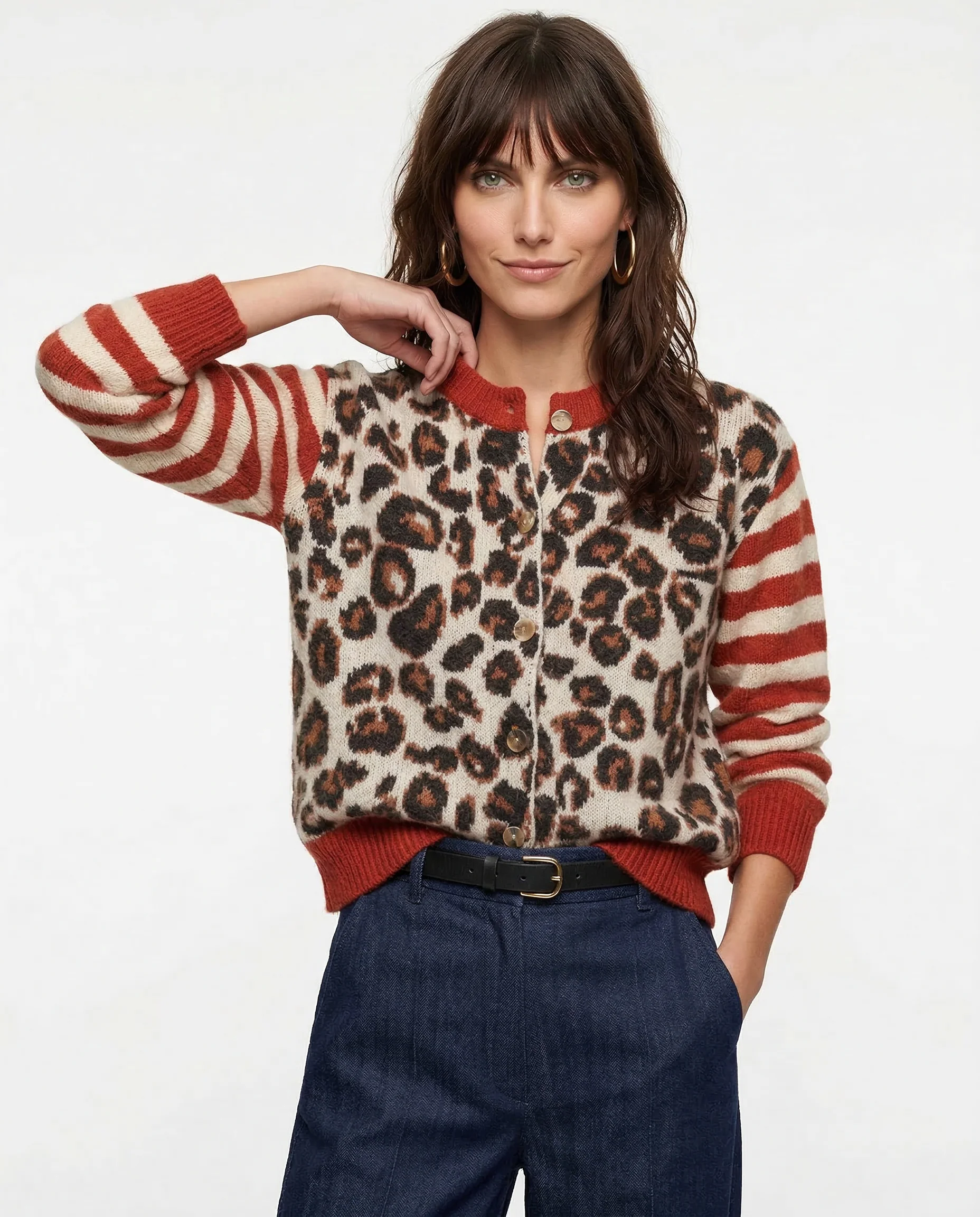 Why choose one style when you can have two? This cardigan combines stripes and leopard in a way that feels fresh and daring. Relaxed yet stylish, it’s the ultimate go-to for upgrading your casual wardrobe.
