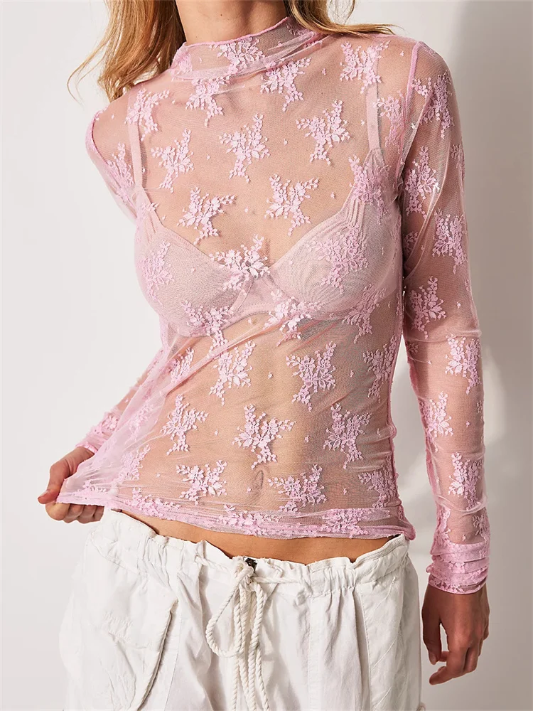 For the fearless fashionista, this high-neck, floral lace top is a must-have. The mesh fabric offers a trendy see-through effect, ideal for adding a romantic edge to your wardrobe staples.