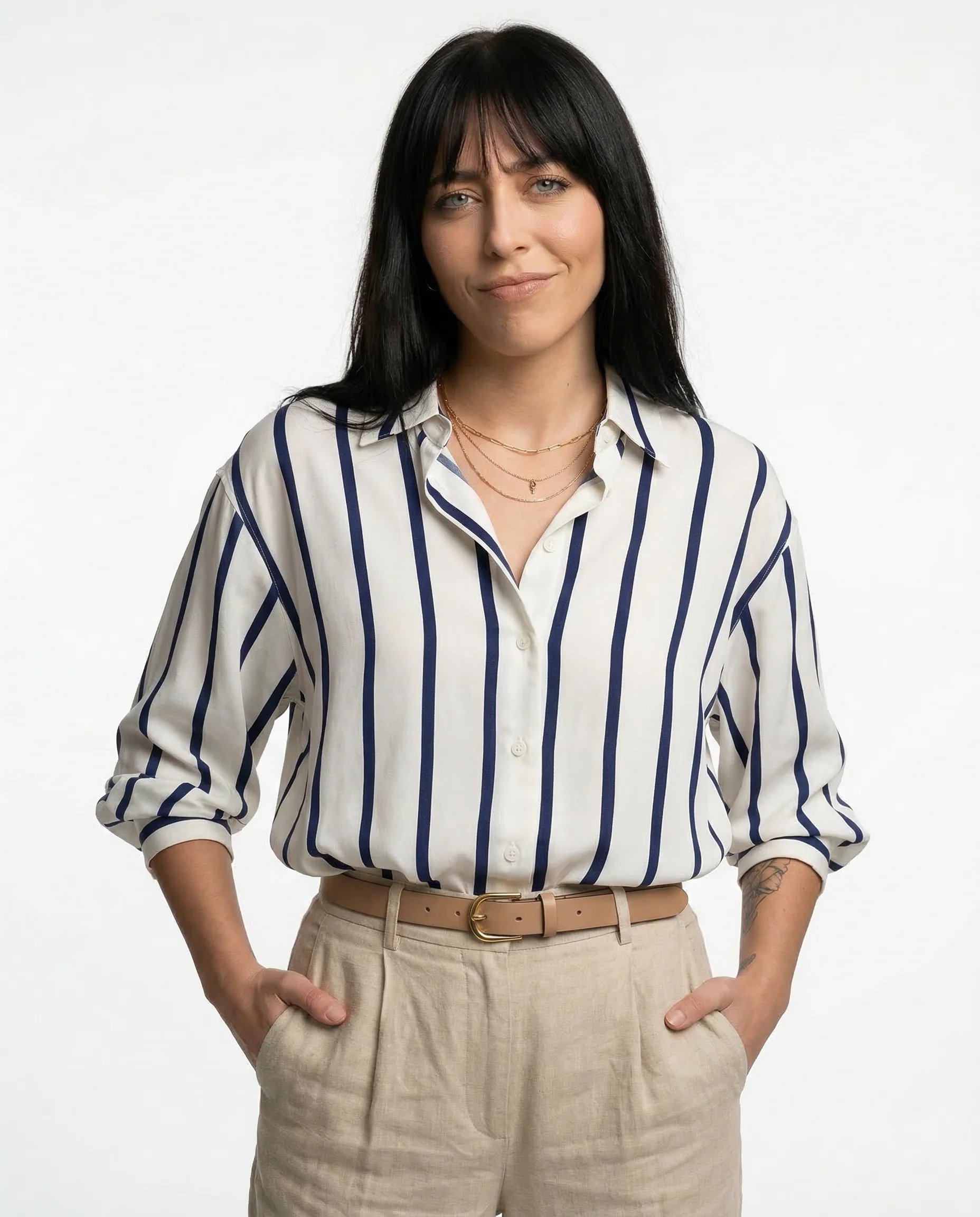 Power moves never looked this smooth. With bold stripes, a silky drape, and just enough slouch to feel effortless, this blouse owns every room—boardroom or bar.