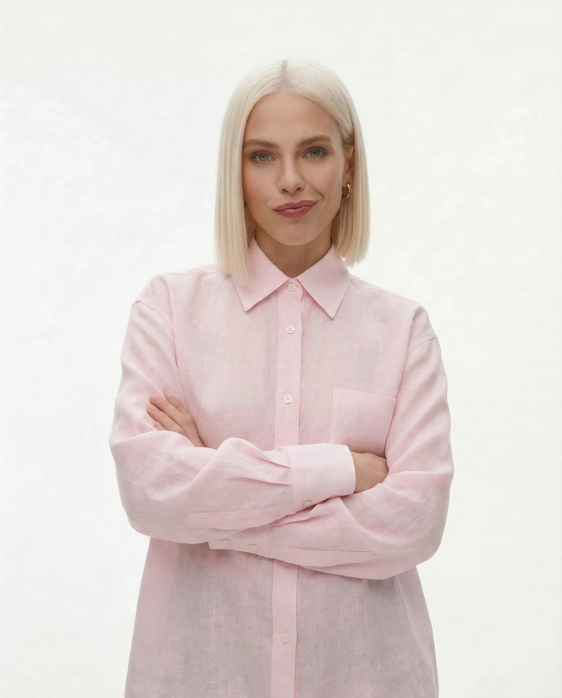 Embrace the timeless appeal of this oversized 100% linen shirt, perfect for a relaxed yet sophisticated look. Its turn-down collar and long sleeves make it a versatile choice, blending vintage charm with modern elegance.