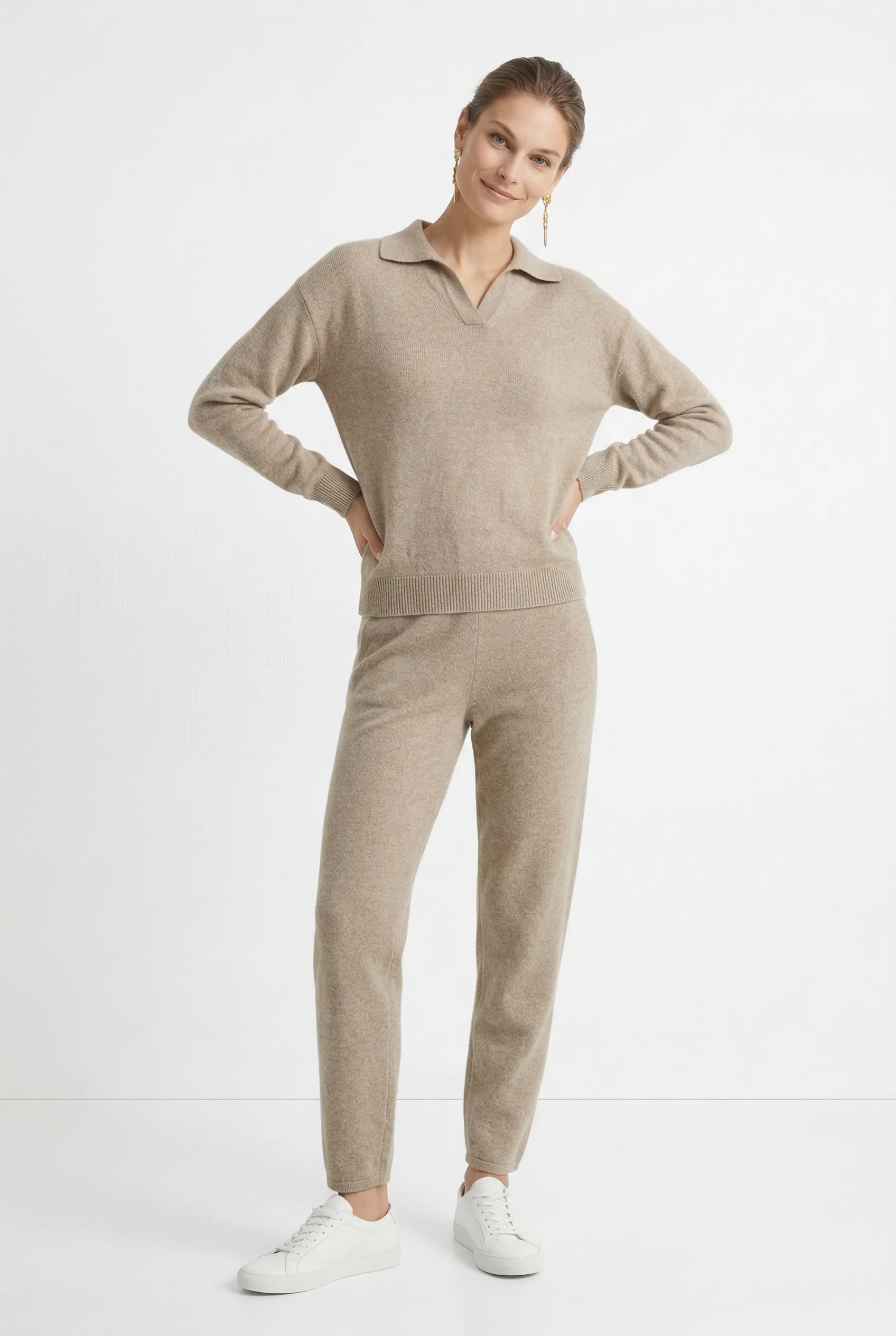 A modern blend of comfort and casual, this two-piece set features a polo-collared sweater and high-waisted harem pants. Soft, relaxed, and effortlessly stylish—ideal for days when ease and fashion come together.